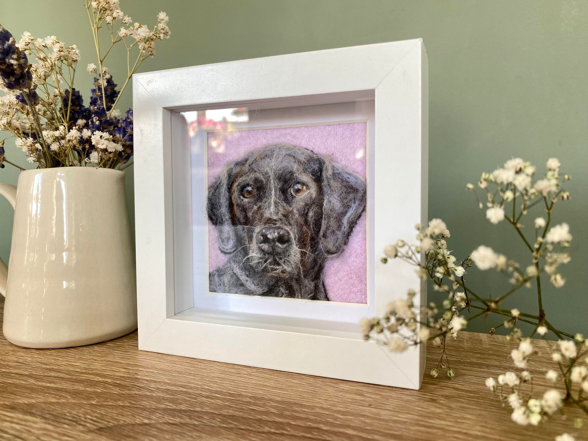 Bring your dog to life in wool! Each piece is lovingly hand-sculpted from wool, using needle-felt techniques and framed as a mini work of art — a special keepsake or gift for any dog lover.